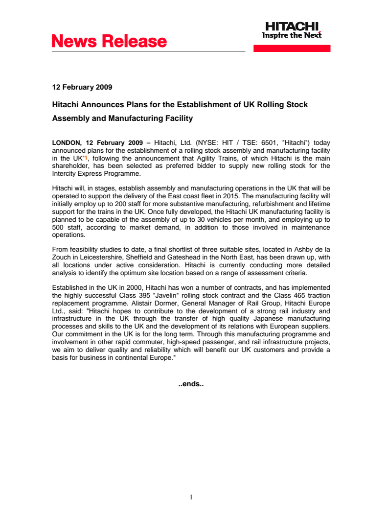 Hitachi, Ltd. (NYSE: HIT / TSE: 6501, "Hitachi") today announced plans for the establishment of a rolling stock assembly and manufacturing facility in the UK*1, following the announcement that Agility Trains, of which Hitachi is the main shareholder, has been selected as preferred bidder to supply new rolling stock for the Intercity Express Programme.