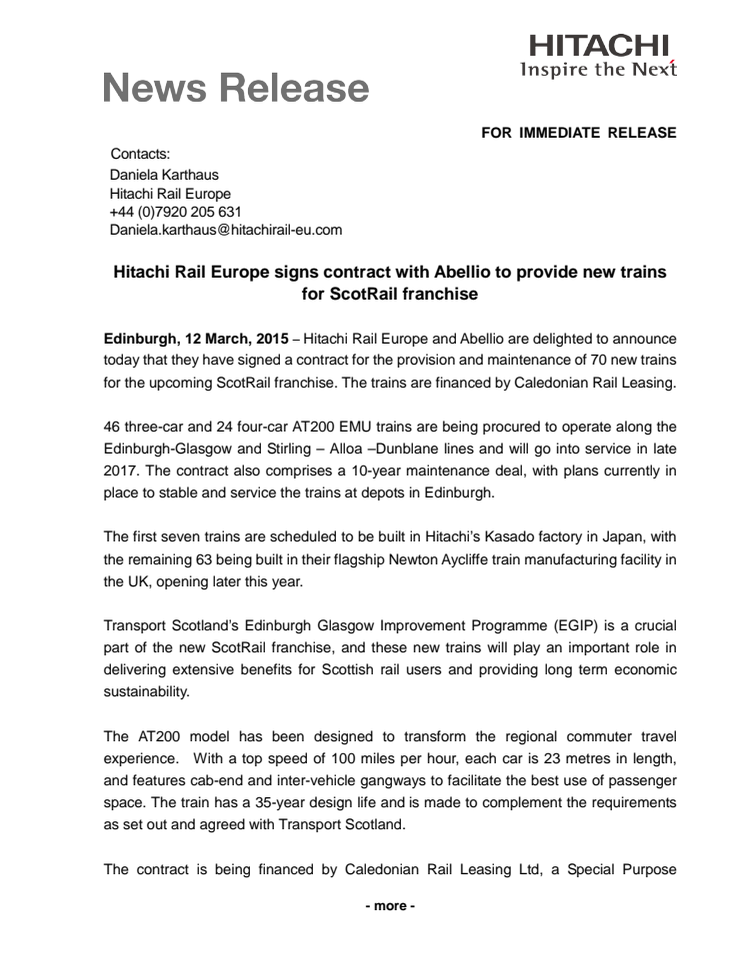 Hitachi Rail Europe and Abellio today announced that they have signed a contract for the provision and maintenance of 70 new trains for the upcoming ScotRail franchise. The trains are financed by Caledonian Rail Leasing.