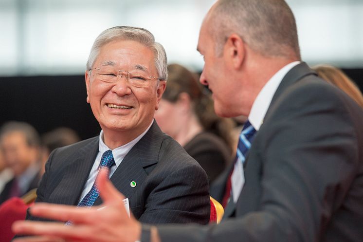 Hitachi CEO Hiroaki Nakanishi with Hitachi Rail Global CEO Alistair Dormer at Newton Aycliffe opening ceremony