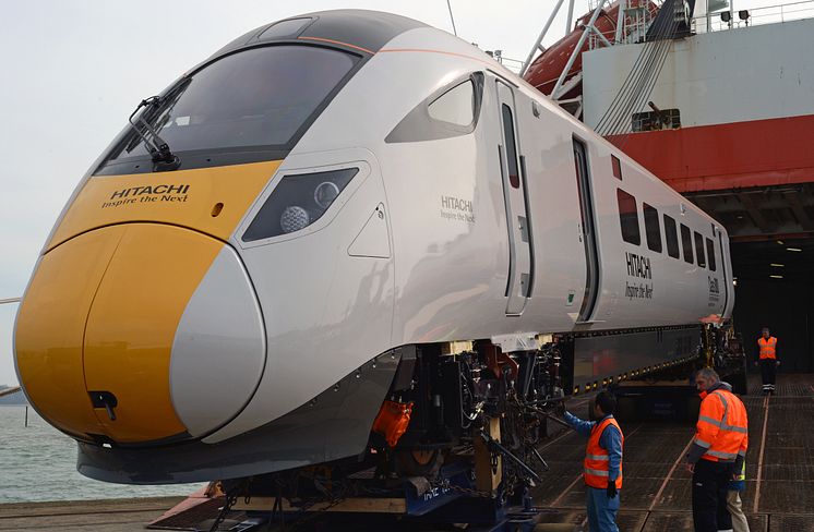 Port of Southampton, March 12, 2015 – Rail Minister Claire Perry MP, Hitachi Rail Europe Ltd, Hitachi Transport and shipping company Wallenius Wilhelmsen today celebrated the arrival of the first pre-series Class 800 train for the Intercity Express Programme (IEP) at the Port of Southampton, UK.